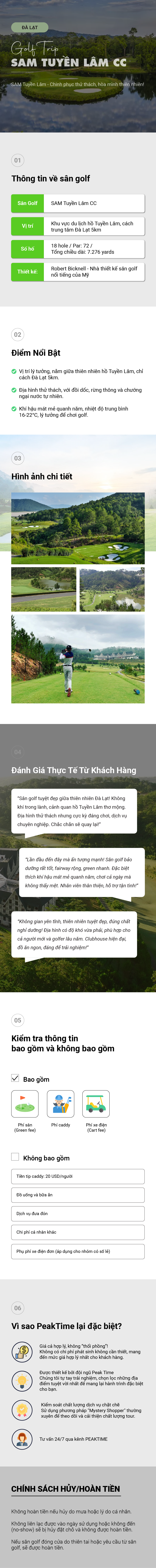 ⛳ Cùng hòa mình vào thiên nhiên và tận hưởng golf! ⛳ PEAKTIME X Dalat SAM Tuyen Lam CC ⛳ 🏌️ Gói này đã bao gồm phí green, phí caddy và phí xe điện. 🚩 Cách sân bay 35 phút, cách trung tâm thành phố 30 phút. Sân golf SAM Tuyền Lâm CC có địa hình tự nhiên với hồ Tuyền Lâm ở trung tâm, các đồi cao và chướng ngại nước, tạo nên độ khó thử thách. Điều này giúp vòng golf không bị nhàm chán và mang lại trải nghiệm thú vị hơn! 💁 Thời gian tee-off sẽ được kiểm tra theo thời gian thực sau khi đặt chỗ, có thể không đúng với thời gian mong muốn. ✖️ Nếu không có phản hồi sau 3 ngày từ khi thông báo thời gian tee-off đầu tiên, đặt chỗ sẽ tự động bị hủy. ✖️ Không thể hủy và đặt lại với mức giá giảm do thay đổi tỷ giá hoặc giá cả. ❗ Mỗi người chơi phải sử dụng 1 túi gậy golf riêng. ❗ Giá cuối tuần sẽ được áp dụng vào thứ Sáu. ❗ Gói này không bao gồm xe đưa đón, khách cần tự di chuyển. ‼️ Từ 01/01/2025 đến 31/05/2025, không thể hủy hoặc hoàn tiền sau khi đặt chỗ. ✅ Xác nhận ngay lập tức 💰 Đảm bảo giá tốt nhất ❌ Hủy miễn phí trước 2 ngày 📱 Voucher điện tử 📩 Gửi voucher trong vòng 1 ngày làm việc 📜 Xác nhận đặt chỗ trong vòng 1 ngày