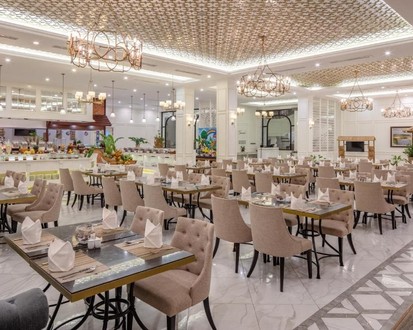 - Merkado: Nhà hàng chính của resort, phục vụ hải sản tươi ngon với view hồ và khu vườn xanh mát.